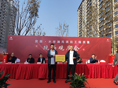 10月19日,第三工程公司承建的安居•水岸澜苑项目工程质量现场观摩会暨广平县2023年度建设质量样板工程颁奖仪式隆重举行。邯郸市建筑工程质量管理站副站长徐金峰、张少军科长、广平县建筑工程质量监督站,广平县在建工程各施工单、监理单位、地产开发商代表等120余人参加活动。安居•水岸澜苑项目经理吉光代表公司接受“2023年度建设质量样板工程”奖牌。