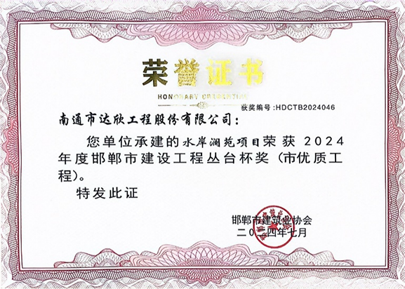 日前,从邯郸市建筑业协会获悉,水岸澜苑项目获邯郸市2024年度优质工程---“丛台杯”工程。